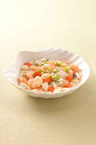 1 蝦子去沙腸、去殼後,洗淨;嫩豆腐用熱水汆燙,瀝乾水分,切小塊;胡蘿蔔洗淨,去皮切小丁;香菇去蒂,洗淨切絲;蔥洗淨切末,蛋打成蛋液。