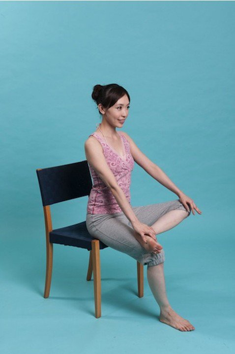 1.坐穩在椅子上,身體保持挺直,將右腳放到左膝上方。