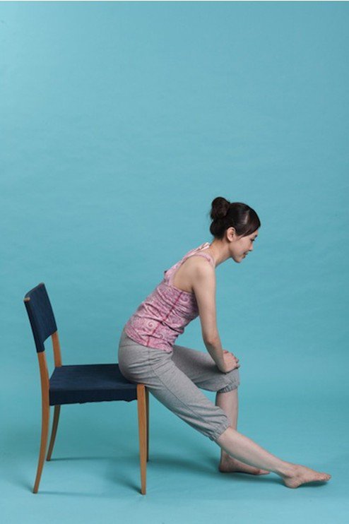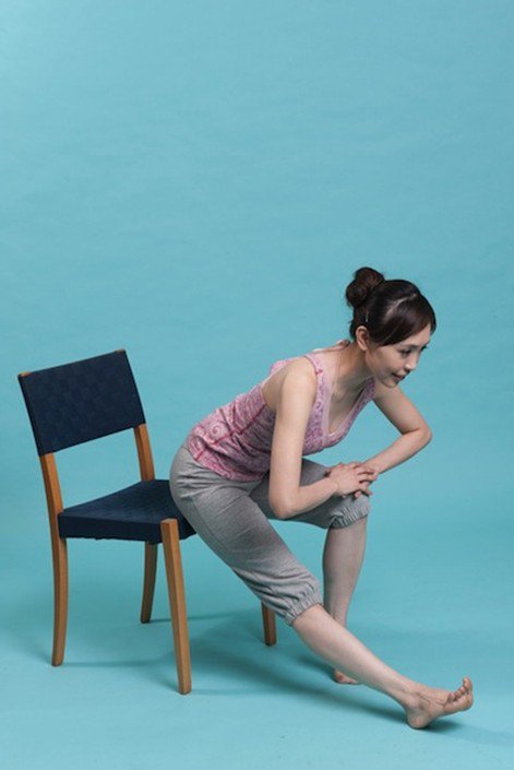1.椅子只坐1/3,右腳往前伸直,盡量將腳底貼在牆壁上。