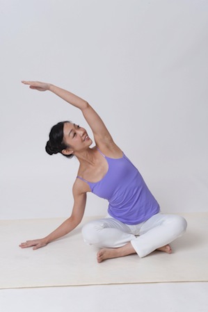動作START:盤腿坐在地上,吸氣預備,右手舉高後再將身體彎向左邊,吐氣後回復坐姿,之後再換向右邊,左右為一次,重覆3~5次。