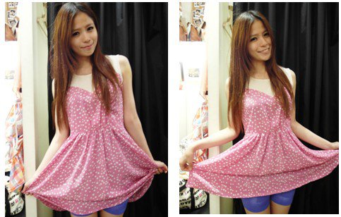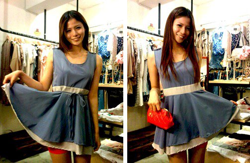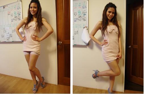 粉紅色的蝴蝶結小洋裝很可愛,但如果露出黑色的安全褲就太奇怪了,淡紫色剛剛好,一點都不突兀,配上同色系的紫色高跟鞋,好像慾望城市的夏綠蒂呀!!