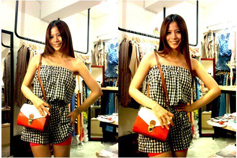 近來很流行的連身褲,格紋是萬年不敗款,但因為是黑色顯得有點重,所以配上桃紅的魔塑一分褲,看起來變活潑了,背個有點復古的方包,就很有型,超適合跟姐妹們去喝下午茶!!