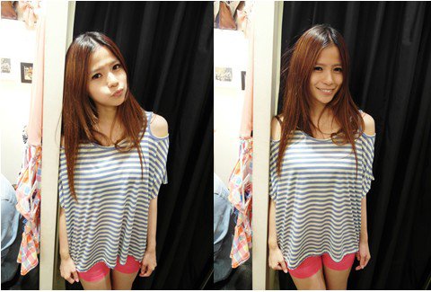 藍紫色的條紋露肩長版T,休閒又有點小性感,把魔塑一分褲直接拿來當內搭褲穿也ok,比起一般長度的內搭褲,輕鬆涼快許多,去郊外踏青這樣最舒服。
