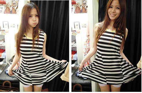黑色條紋小洋裝好有海洋的感覺,鵝黃色的滾邊跟淡紫色一拍即合,轉圈風大露出來都不怕!!