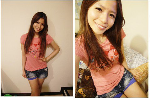 又是大學生必備的T-shirt加牛仔短褲,淡紅色的上衣剛好跟寶石藍搭到,整個人青春亮眼,開學就這樣穿來吸引喜歡的學長注意!!!