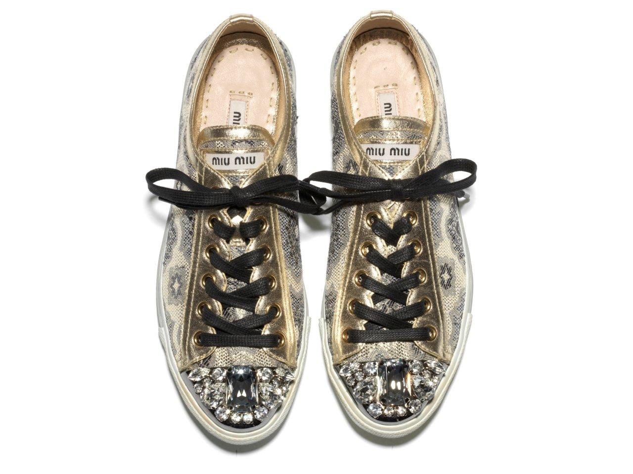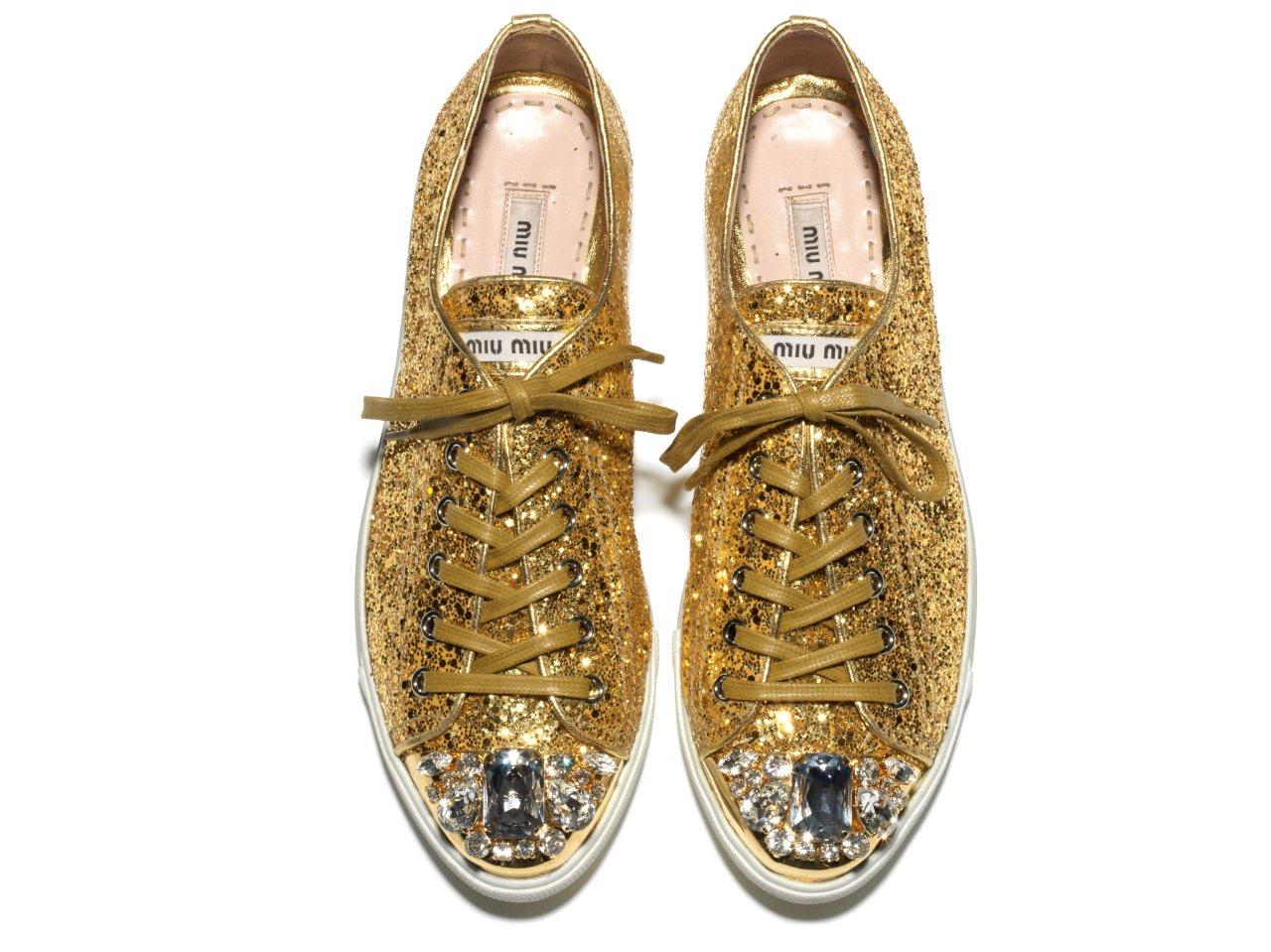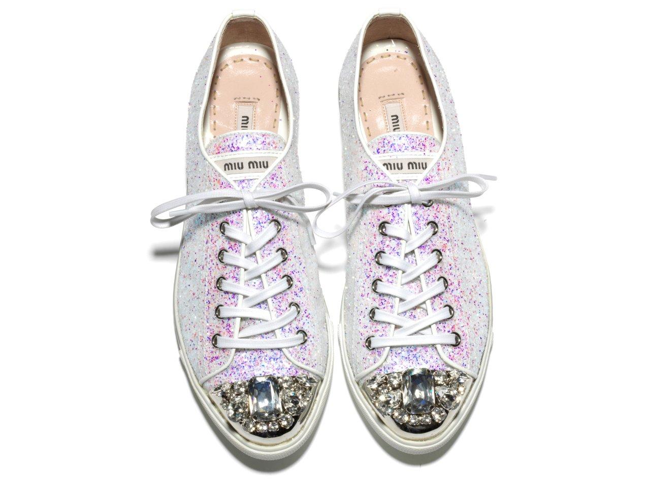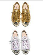 還記得春夏時 Miu Miu 所推出的螢光搖滾羅馬鞋嗎?繼春夏之後2011秋冬 Miu Miu 又再次推出了高調閃耀鞋款「Bling Bling運動鞋系列」,將街頭的鞋款注入新的奢華靈魂,成為華麗的時尚單品。此系列一共推出了粉紅、金、銀、黑等色,一雙售價為NT15,000元起。