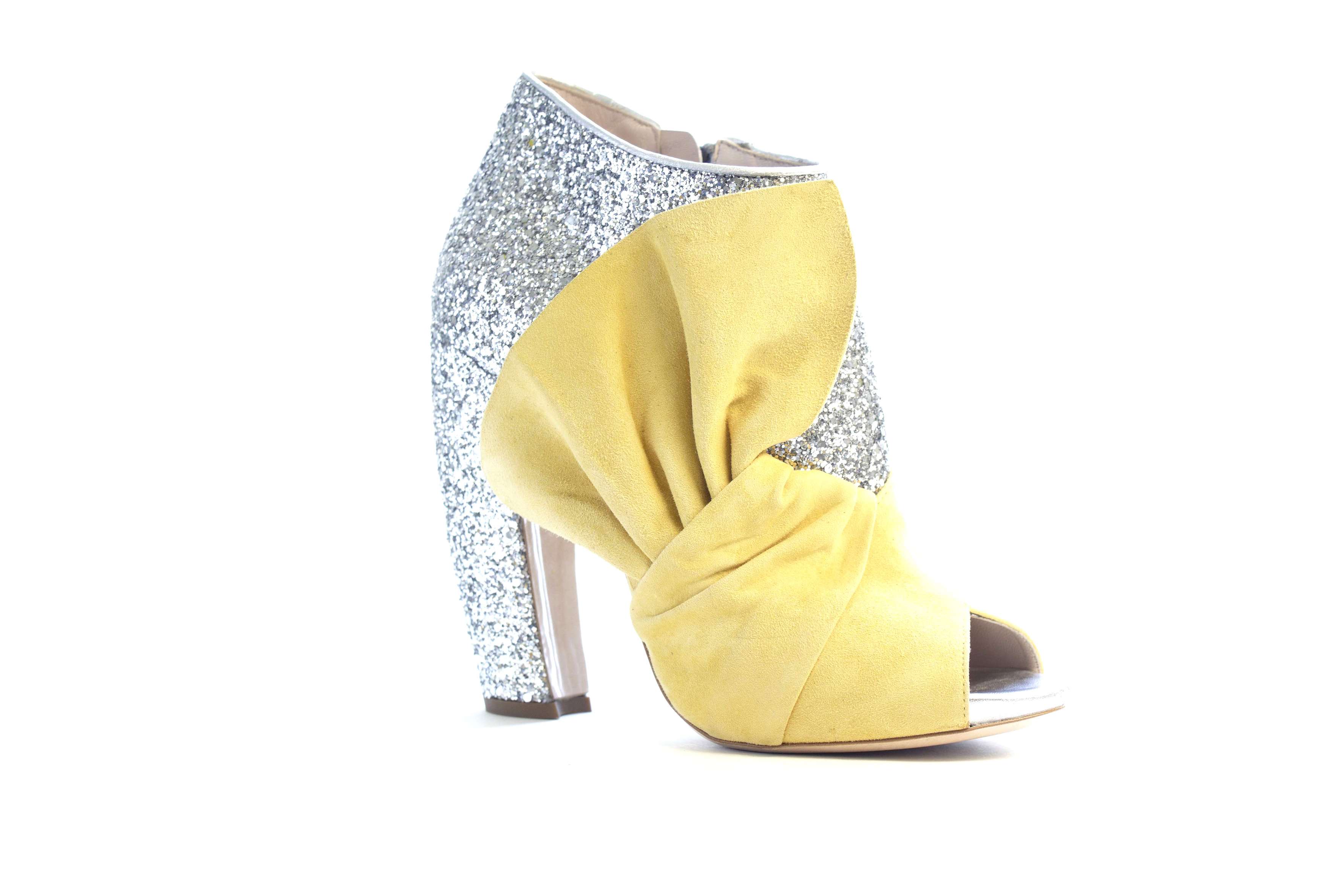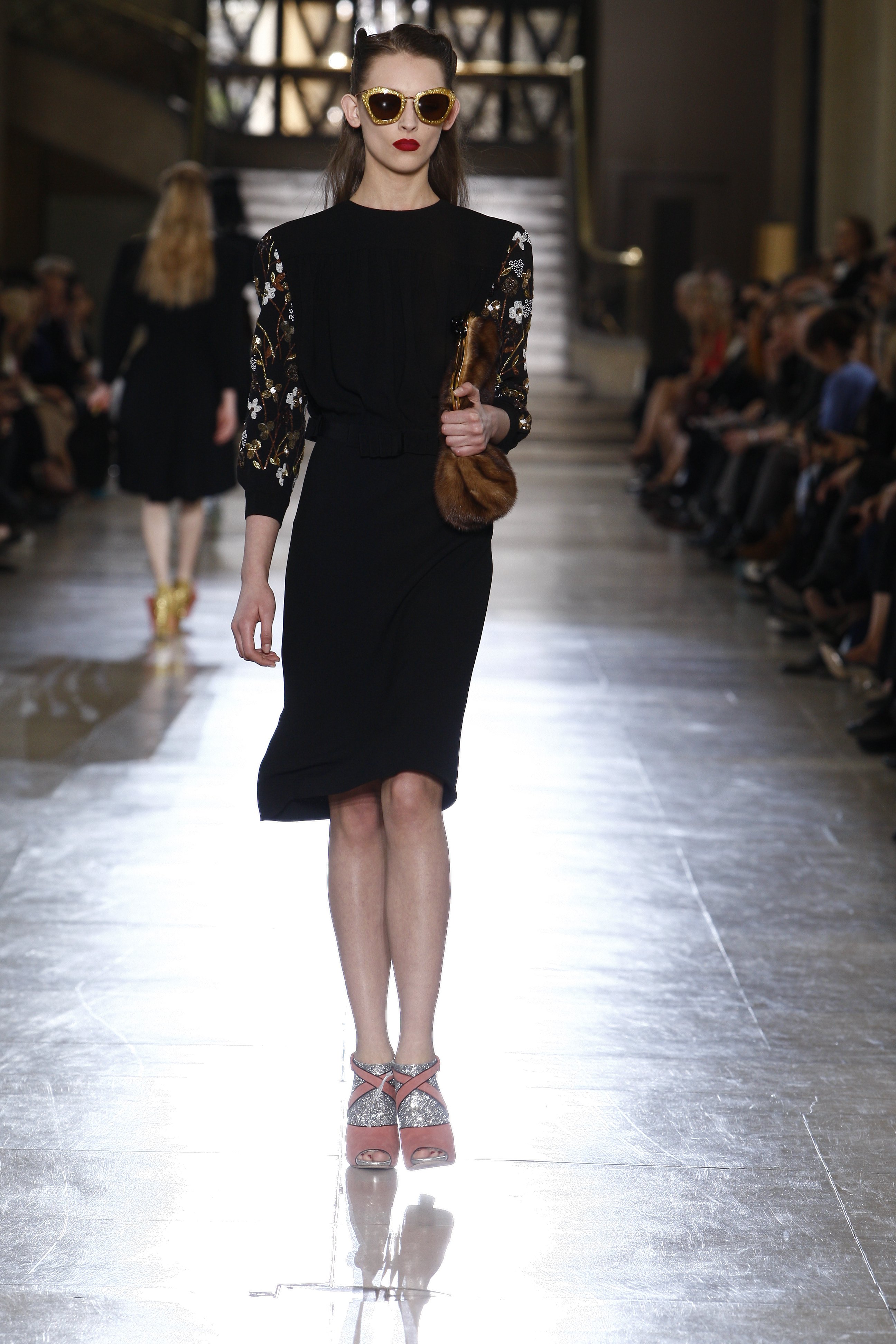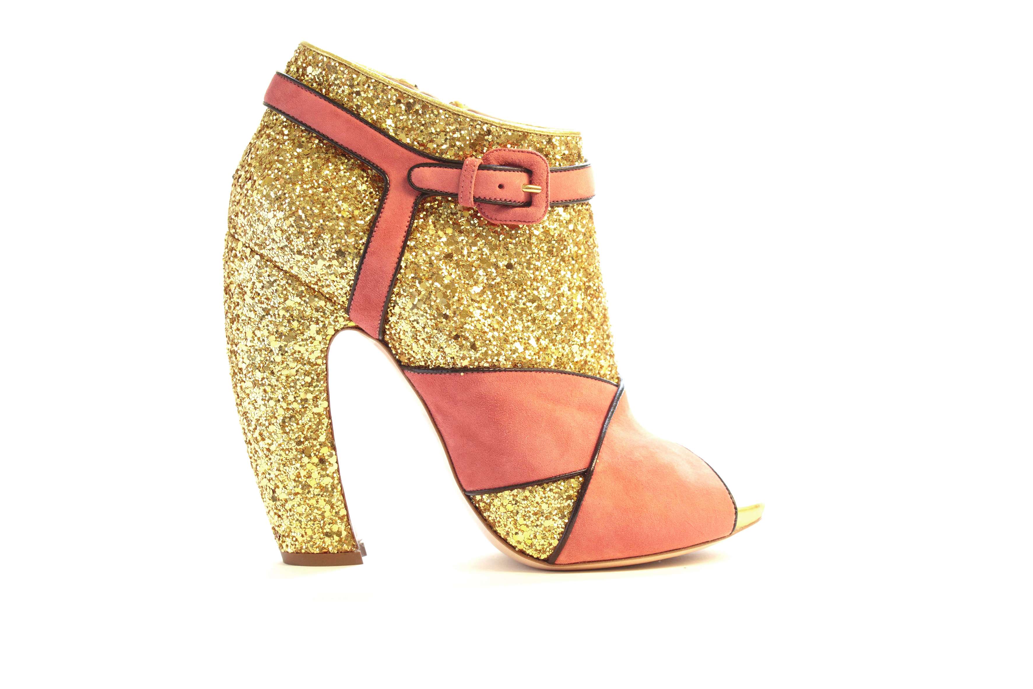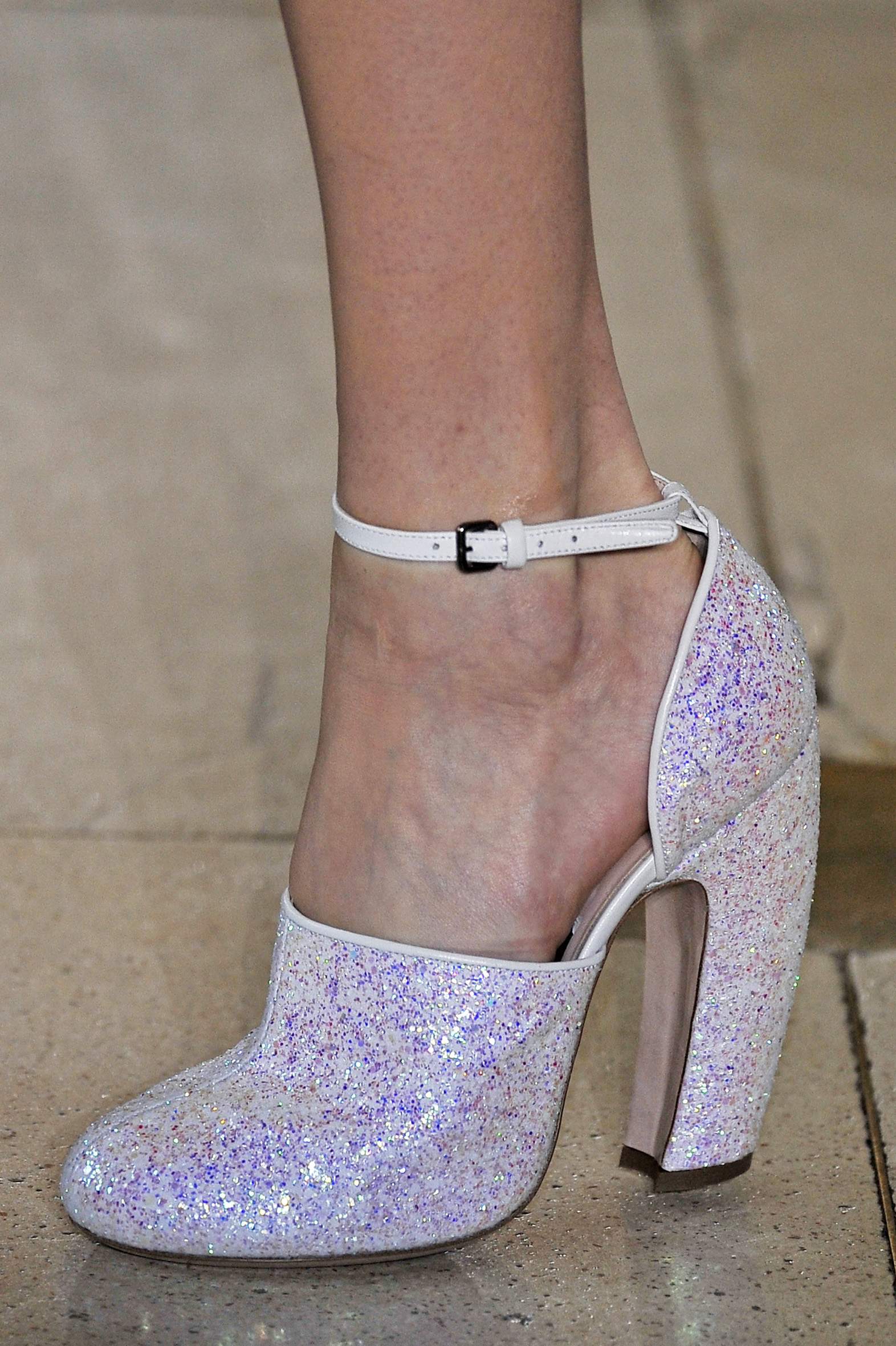 另外,在本季 Miu Miu 的伸展台上也可以看到許多 Bling Bling 的鞋款,像是充滿復古的拼貼踝靴系列,或是復古包鞋系列,都可以見到 Bling Bling 的閃亮光芒,並且在配色上及造型上也都非常可愛甜美。而在鞋跟上的設計,也一致採用了讓女人們走起路來搖曳生姿的香蕉跟,更富有女人味。