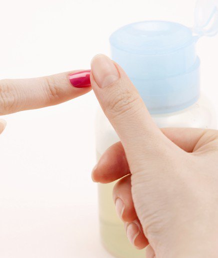 1.用大拇指稍微沾取去光水,在指甲油沾到的部分輕輕按壓。