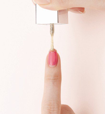 2.用亮粉指甲油輕輕沾黏於剝落處。修復時,使用亮粉指甲油或珠光指甲油,修飾不同顏色指甲油的接縫處,效果最好!