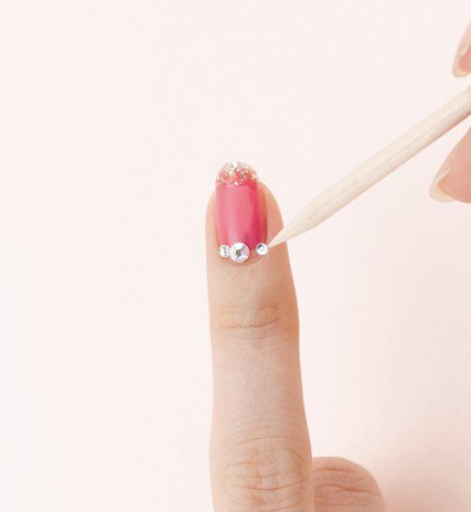 3.如果剝落處是在很難擋住的指甲周邊,不妨用水鑽或指甲貼紙做裝飾。想要提升持久力,請再塗一次護甲油就可以囉!