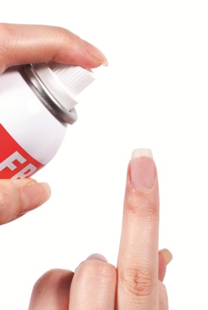 6.將甲片膠催乾劑在距離指甲15mm處,以30秒為間隔,稍稍噴灑2~3次,並等待10秒。