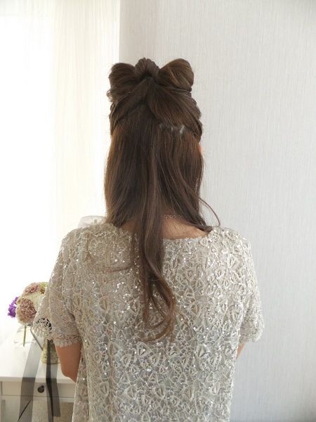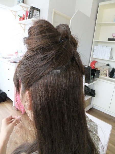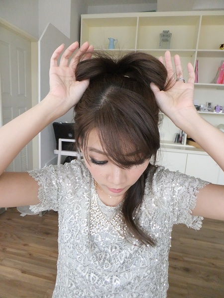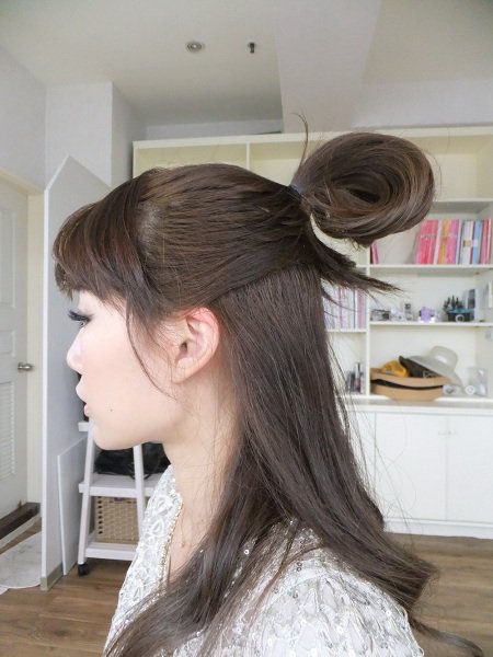 綁一個高高的公主頭,髮尾折成一個小丸子。