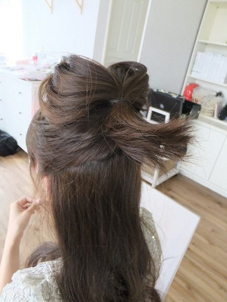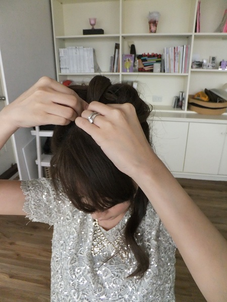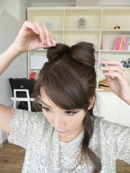 將後面多餘的髮束往前收好,剛好變成蝴蝶結中間的那個「結」,再用小黑夾夾好固定。
