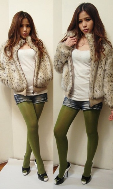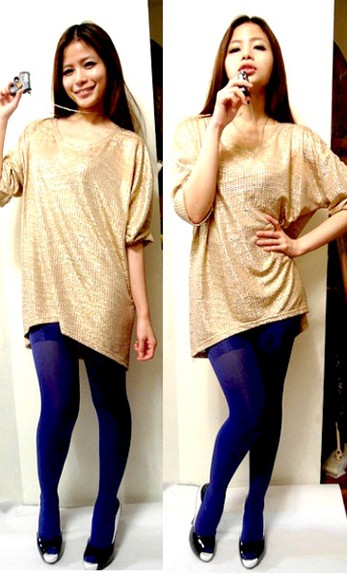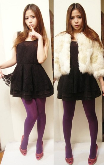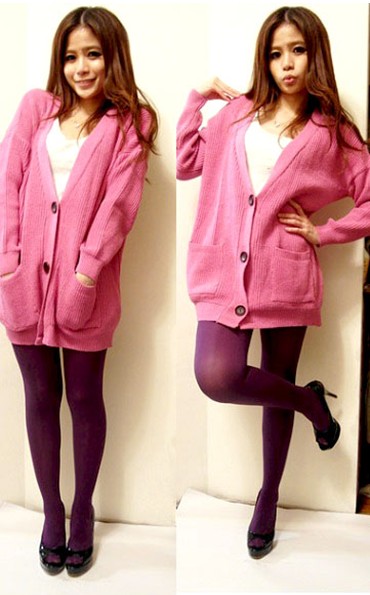 今年韓國很流行這種阿嬤的大針織外套,街上五顏六色的款式一堆,選可愛的桃紅色就不怕老氣,想學韓國女生的話綁個團子頭和戴上粗框眼鏡就有fu,桃紅和紫色很相配,這樣的穿著雖然沒有露很多,可是因為桃紅色很亮,所以穿去party也ok,不過可別忘了一定要穿高跟鞋才能增加氣勢喔!
