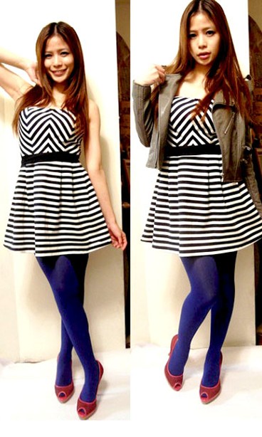條紋洋裝也是雜誌裡的常客,女孩們人手一件,不過這件可不是一般的條紋洋裝喔~大家有沒有發現上下半身的條紋不一樣呢?單穿就很美,如果想要更酷的話可以搭個皮外套,選了灰色的外套,讓上半身感覺不會太重,跟輕快的寶藍褲襪做呼應。