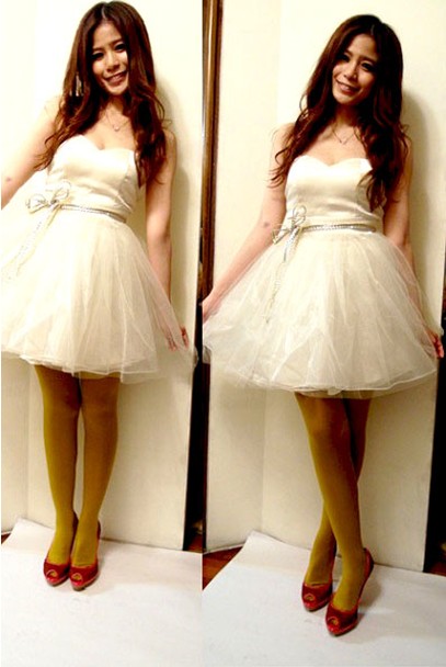 白色紗裙禮服超夢幻,像新娘一樣,特別在腰部綁上金色跟銀色的蝴蝶結腰帶,增加層次;白紗雖然很美,但特色不足,不過配上芥末黃褲襪,就完全不一樣了,甜美中增添了個性,比單穿白紗禮服更搶眼。