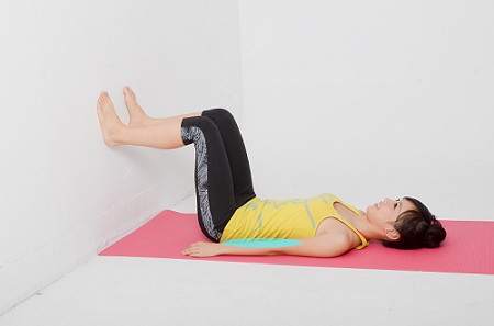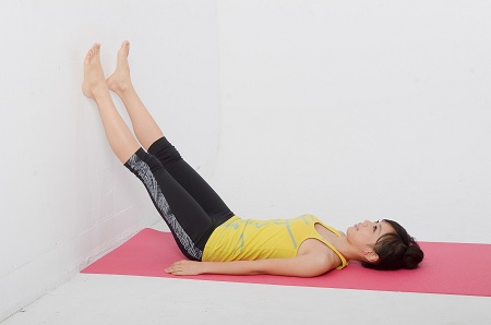 平躺,雙腳彎曲呈90-90,腳掌踩在牆上,骨盆、腰及下背部平貼地上,舒緩腰痠,讓全身肌肉放鬆、休息。