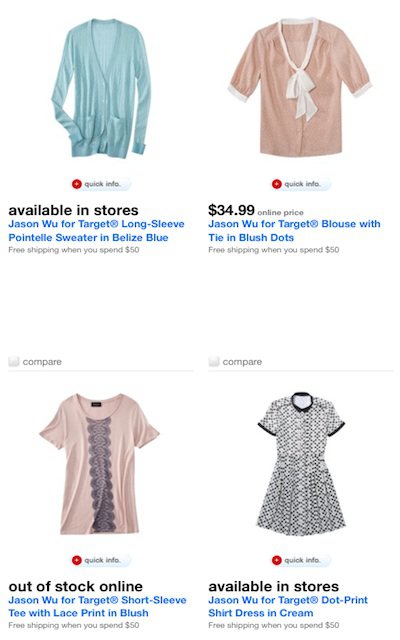 知名設計師吳季剛(Jason Wu)與美國量販店Target合作推出聯名春裝,在本月5日正式上市。價格走的是平價路線,約19.99美元至59.99美元不等(台幣約為590~1,770元),親民的售價加上設計師的名牌效益,很快就掀起了一股熱潮,開賣才不到24小時,Target的線上商店便多次發出out of stock online(無網路庫存)、available in stores(僅店內販售)的訊息,雖然陸陸續續補貨,但看得出來銷售的速度依然驚人。