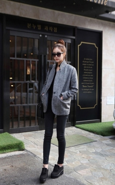全身黑配灰的西裝外套,腳上踩著後底鬆糕鞋,這樣搭配起來還真有個性!