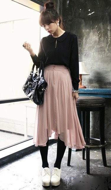 飄逸的雪紡紗長裙中間比較短兩旁比較長,這樣走起路來會飄啊飄的,非常甜美又不失時尚喔!