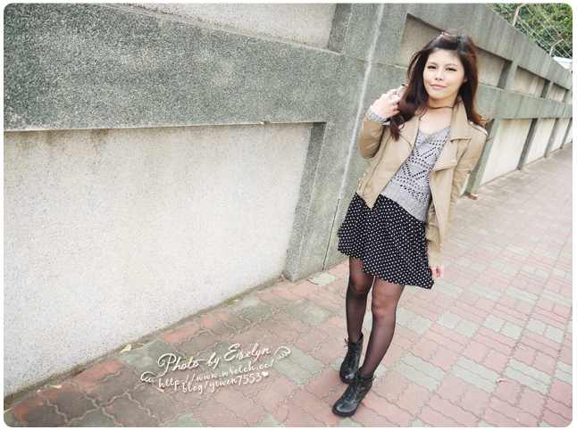 1. 奶茶色皮衣 mix 針織上衣+水玉點點短裙