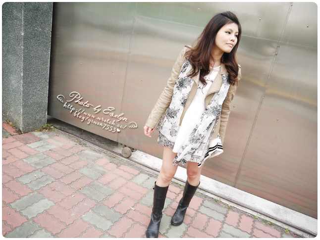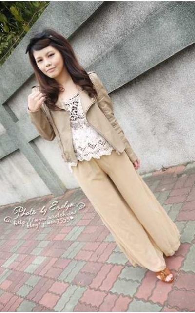 8. 奶茶色皮衣 mix 針織背心+雪紡長褲