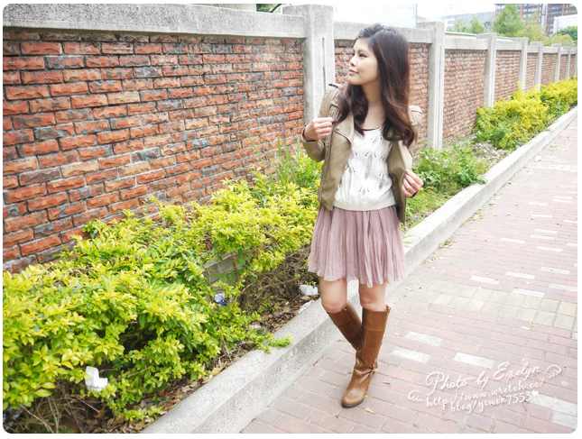 7. 奶茶色皮衣 mix 針織短版衫+百褶雪紡短裙