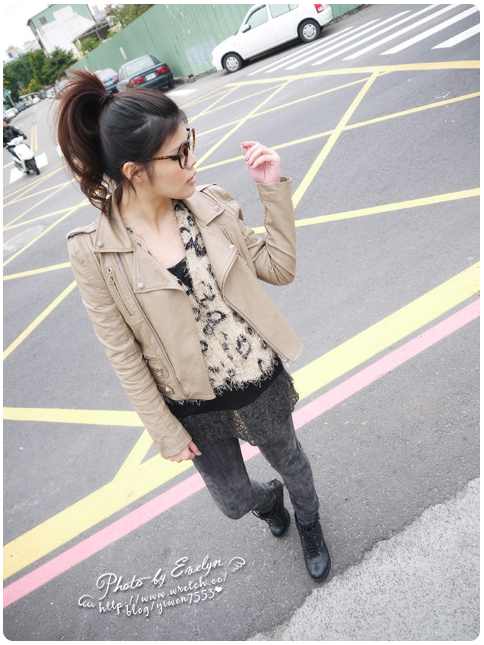 10. 奶茶色皮衣 mix 豹紋小外套+黑色針織背心+雪花窄管褲