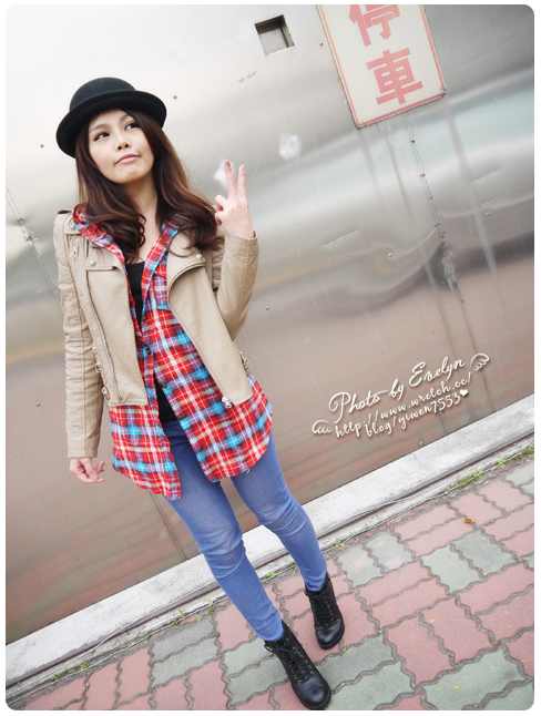 12. 奶茶色皮衣 mix 格子背心+淺藍內搭褲