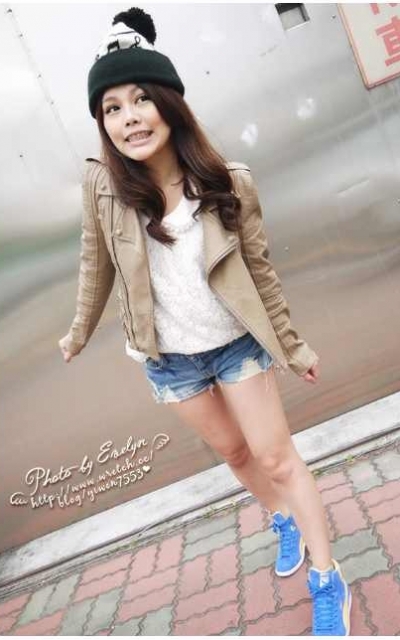 13. 奶茶色皮衣 mix 蕾絲白T+淺色牛仔短褲