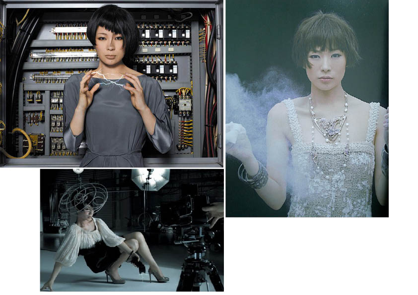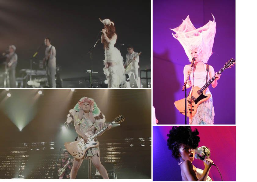 演唱會的造型算是最華麗的,我特別喜歡這三個:纏滿蜘蛛網的鹿角頭飾,搭配層次長裙,華麗又強勢,還帶著頹廢的浪漫,不過這個造型和Alexander McQueen 2006秋冬的蕾絲鹿角實在有點太像;異取同工之妙,2011年東京事變的《Discovery》演唱會椎名林擒換上動物骨骸做頭飾,全白的紗質短裙,配上毛毛長靴,讓我想到宮崎駿的《魔法公主》,不過這個公主很搖滾;大花朵配上印地安式大羽毛頭飾,身上穿的卻是旗袍式的小洋裝,超強的極度風格混搭,色彩也是強烈用色,手法相當高明呀。