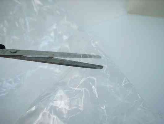 1-準備一個大型的塑膠袋,容量約為牛仔褲的3 倍大小,在袋底的地方剪出兩個通風用的小洞。