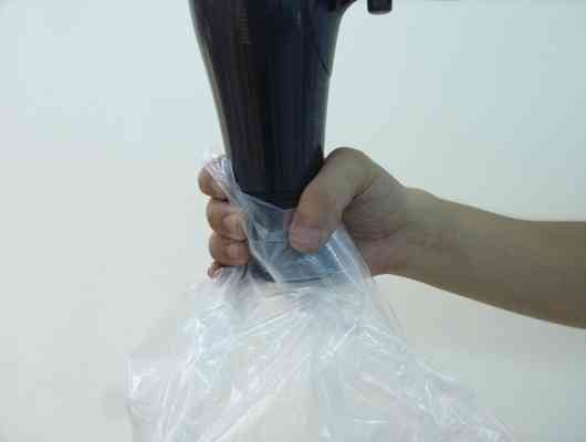 3-當吹風機吹出的熱風灌飽塑膠袋時,將內裝的牛仔褲上下晃動1 ~ 2 分鐘,這樣可以讓褲子受風均衡,也可避免褲子塞住排氣的小洞。