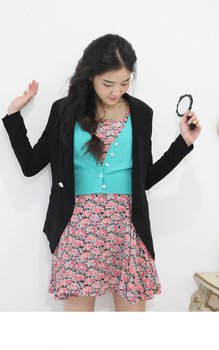 韓妞妞真的在穿搭上是令甜凱莉不得不佩服,簡單深色系的西裝外套,誰會想在中間多加件飽和色的針織衫,鮮明色彩隔開與裏頭的碎花反倒不過於突兀,甜美度更上!好厲害啊~