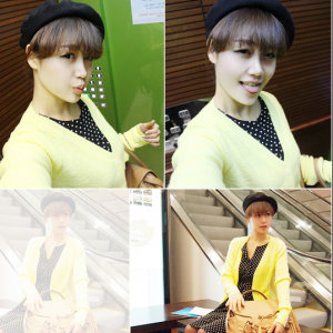 很有小香風的質感,韓妞聰明地在領口上加點配件不讓單純的雙色顯得過於死板單調,優雅極了~