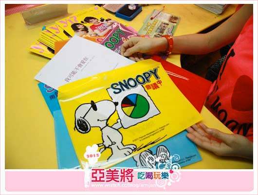 小朋友乖乖的聽話,一定要給予讚賞,活動圓滿結束後我打算用史努比文件夾當小禮物,文件夾七彩繽紛,小朋友可以挑自己喜歡的顏色