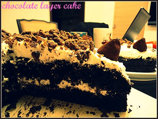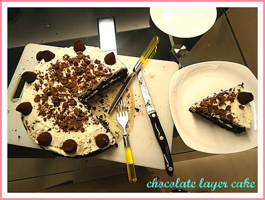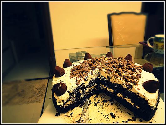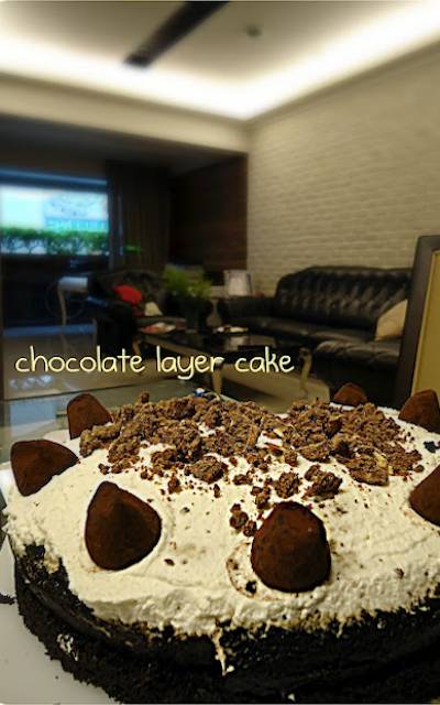 另外, 裝飾上, 我用了大家都熟悉的義美巧克力酥, 和好市多的松露巧克力。市售的現成零食都是很好的裝飾小物,因為通常它們都做的很漂亮。用家裡做的蛋糕體,配上外面賣的零食裝點,讓蛋糕外表看起來美觀又吸引人, 然後蛋糕本身,卻又沒有額外的化學添加物,不是很好嗎?