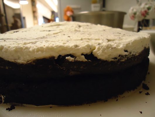 蛋糕放涼後, 把蛋糕從側面剖一半。一定要完全冷卻後, 才可以割成一半!我是用八吋的模, 所以只夠剖一半分成兩層。 將鮮奶油打發, 打成你想要的硬度。抹在雙層之間和最表面。最後用任何水果或零食裝飾。