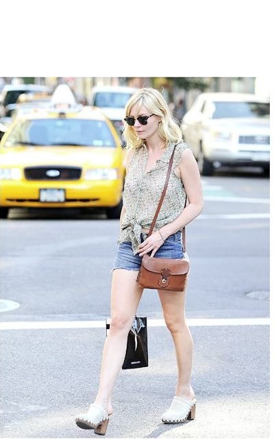 在紐約蘇活區直擊到Kirsten Dunst最新私服穿搭,展現女孩時尚的牛仔風格。印花襯衫下擺隨意綁起,增添可愛復古氛圍。搭配剪短的牛仔短褲完成適合夏日的清新穿搭。腳上的木鞋突顯輕鬆氣氛,「Ray-Ban」墨鏡加上鏈帶不經意地顯露個性,小物使用相當高明!