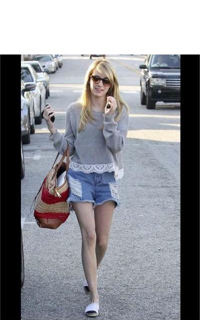 休假日前往髮型沙龍的Emma Roberts,寬鬆合身的牛仔短褲顯露男孩風,上衣選擇有蕾絲的運動衫,增添女孩氛圍。腳上是的「SOLUDOS」草繩底便鞋,展現渡假村氣息。