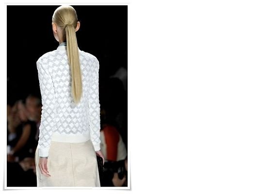 是說馬尾幾乎從來沒有與流行絕緣,舉凡令人產生好感的髮型絕對少不了馬尾。但2012的流行馬尾可不能像沈佳宜般還是剛出生的 little tail,我們要的是又長又直的長馬尾。2012 的馬尾造型關鍵就在於妳必須把前額梳得精光,連一滴鬢角都不能留。同時,為了避免不小心成了阿桑,切記髮圈束完馬尾後,別忘了挑起一縷秀髮,在髮圈外繞上一圈,讓整體髮型可以更加烏溜一體。