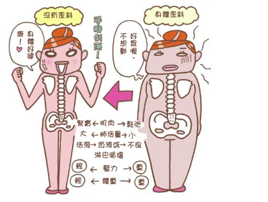 部肌肉若僵硬緊繃,略微彎曲呈S形的脊椎會變形,身體將失去彈性。