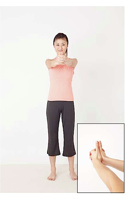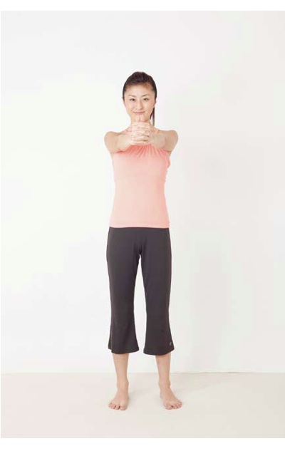 1、雙腳打開與腰圍同寬,雙手手臂向前伸直,豎直兩手的大拇指,其餘手指緊扣,並直視著大拇指。