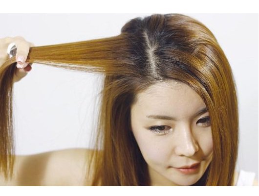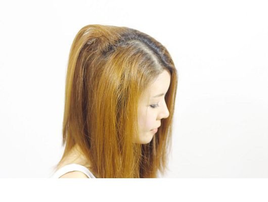 10將分出來的頭髮垂直拉起後,噴上定型噴霧。