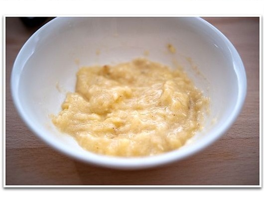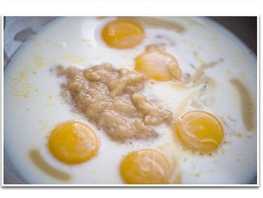 5. 再拌入蛋黃,糖,牛奶,香蕉泥用打蛋器低速打勻備用