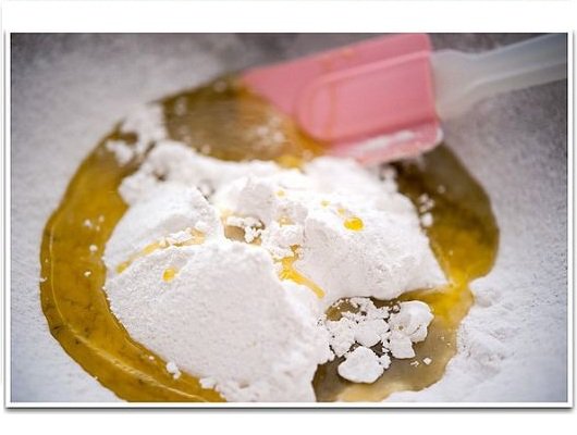 4. 低筋麵粉,泡打粉過篩後,加入橄欖油,用橡皮刀拌勻
