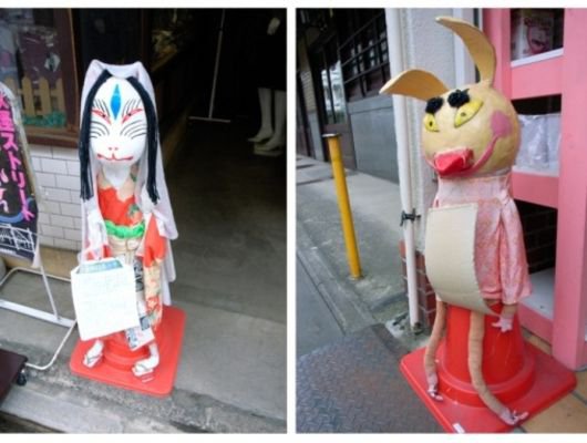 最後,就像日本人在夏日會幫肯德雞爺爺換上浴衣抱西瓜(有機會再來分享一下),商店街的老闆們偶爾幫這群鬼怪們換衣服喔!每年10月在商店街裡還會有特殊的百鬼夜行活動,結合京福電車而舉行的的妖怪列車,另外晚間還集結愛好百鬼夜行故事的人們來這裡裝神弄鬼呢!當然,不定期小型的藝術自由市集『妖怪アートフリマ-「モノノケ市」』也可以找到許多妖魔鬼怪的商品!!