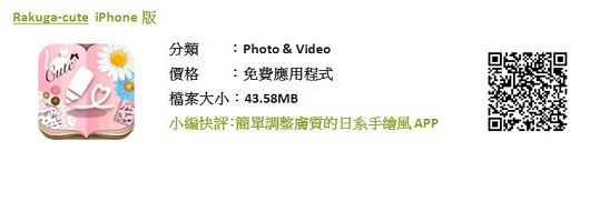 相信每個女孩兒手機裡應該都有這款花俏風的日系APP吧!這款APP在一開始編輯時,就會先進入調整圖片明亮的頁面,而在最後編輯完,還會有不同濾鏡可以選擇… 可見亮度、色調對於女生的圖片來說有多重要了!可惜的是,似乎只能調整明暗度,沒有柔焦作用,所以沒辦法把肌膚拍得美美的。