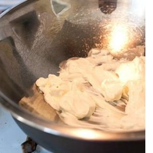 1. Cream Cheese用小火隔水加熱,可快速軟化Cream Cheese,較容易攪打均勻,讓口感更為細緻。但要注意溫度不要太高,大概加熱到溫度40度C(跟洗澡水差不多),立即關火。