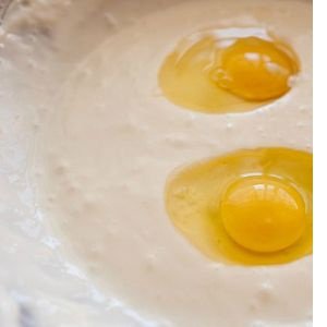 3. 加入牛奶,兩顆蛋,打蛋器低速攪拌均勻